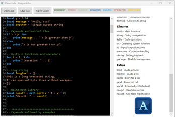 A lightweight Lua script editor for new coders. Features include : color coding and dictionary for easy reference. Top color code legend also for easy reference. Comes with one click demonstration lua file showing context syntax and examples. By default creates a new empty lua script and has save and open . Literally the easiest lua scripting tool out there. No over complicated interface to learn just focus on your script creation. I made this as a visual studio 2026 project because i wanted a lightweight straight forward lua editor for my myself and thought others might like to use it as well. Please not you may need to install .net 10 to use this product as it was build in Visual Studio 2026.